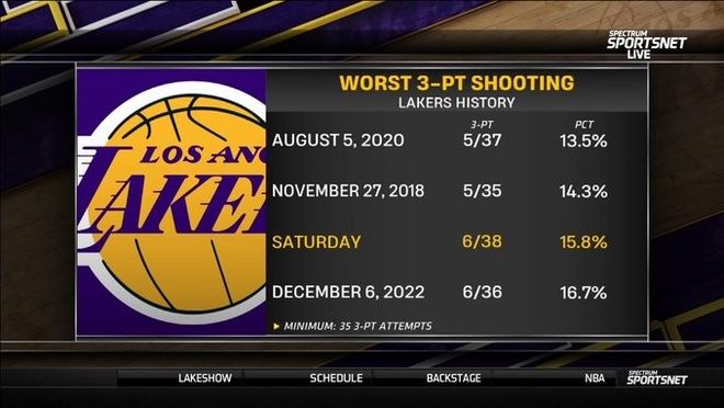 第二,本場(chǎng)比賽湖人三分38中6,命中率15.8%,在隊(duì)史超過35次出手的比賽里,命中率排名第三低。