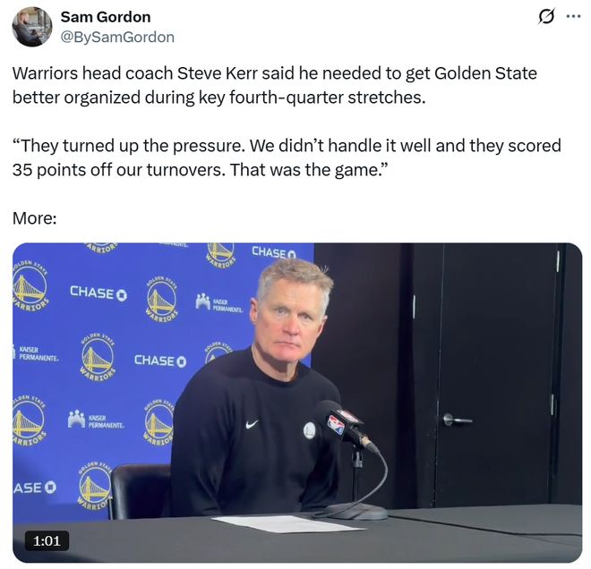 勇士3連勝終結(jié)!庫里空砍39分指出兩大短板 科爾執(zhí)迷不悟還在嘴硬