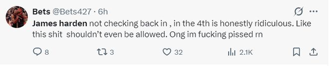 6.哈登在第四節(jié)沒(méi)有登場(chǎng),這實(shí)在是太荒謬了,這種行為不該被允許,我真的要FXXK。