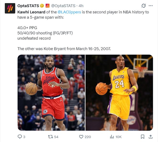 此役后倫納德又創(chuàng)造了多項(xiàng)紀(jì)錄:1.一周內(nèi)倫納德分別拿到55分、45分是生涯第一高與第二高;