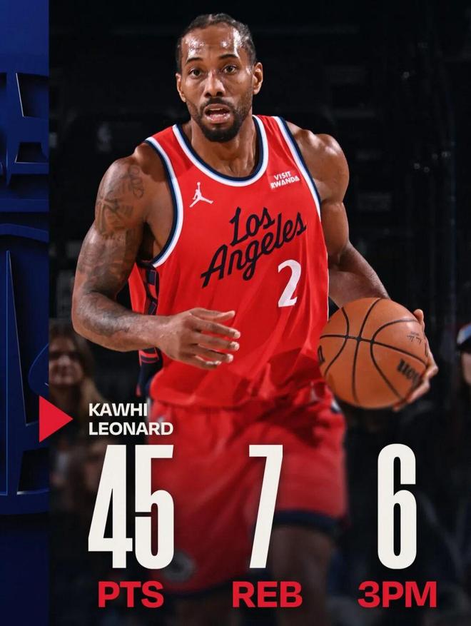 這場比賽,倫納德再一次打出了炸裂表現(xiàn):全場出戰(zhàn)39分鐘,投籃29中16,三分16中6,罰球9中7,得到45分7籃板3助攻2搶斷2蓋帽。