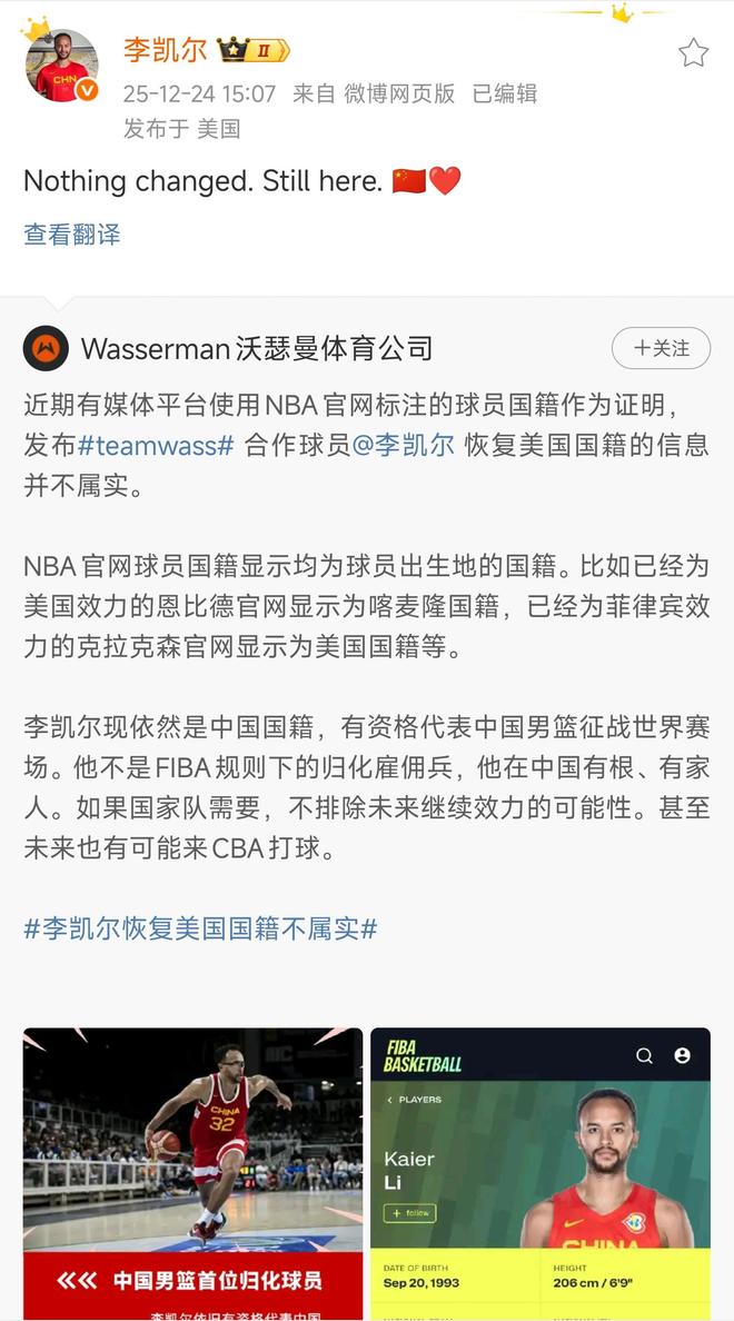 北京時(shí)間2025年12月24日消息。這幾天,關(guān)于中國(guó)男籃首位入籍歸化球員李凱爾,其國(guó)籍是否改回美國(guó)一事情,備受關(guān)注。一些媒體率先發(fā)文,表示李凱爾已經(jīng)改回美國(guó)國(guó)籍。舉例的出處是NBA官網(wǎng)一欄,其國(guó)家填寫的是美國(guó)。
