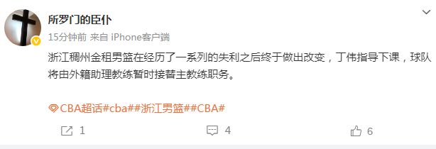 媒體人所羅門的臣仆報道:“浙江稠州金租男籃在經(jīng)歷一系列的失利之后,終于做出改變,丁偉指導下課,球隊將由外籍助理教練暫時接替主教練職務?!?/p>