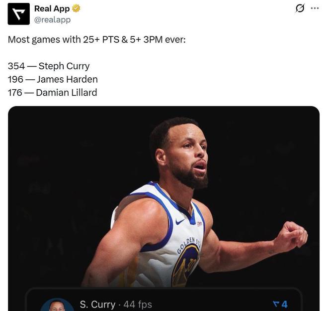 第二項:生涯第354次單場至少砍下25分且命中5記三分,繼續(xù)穩(wěn)居NBA歷史第一,哈登以196次排在第二;
