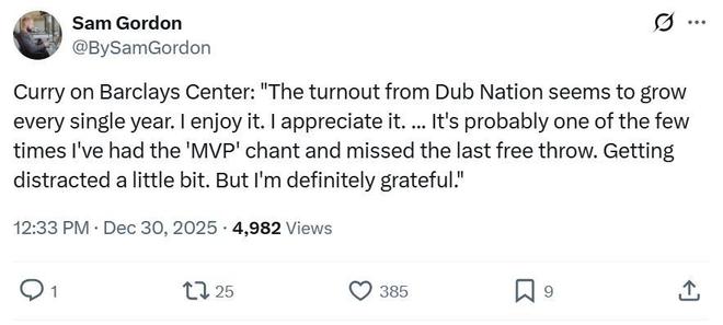 賽后談到巴克萊中心(籃網(wǎng)主場),庫里坦言:“這里是勇士國度的球迷數(shù)量每年都在增加,我很享受這一點,也真心十分感激,但這也是少數(shù)幾次我在MVP呼聲中罰球最后一個罰球的時刻,這有些過分,但我真的感激?!?/p>