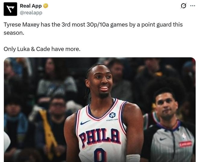 憑借這樣的表現(xiàn),馬克西本賽季已經(jīng)3次單場(chǎng)至少交出30分10助,高居控衛(wèi)位置第三,僅次于東契奇7次與坎寧安6次。